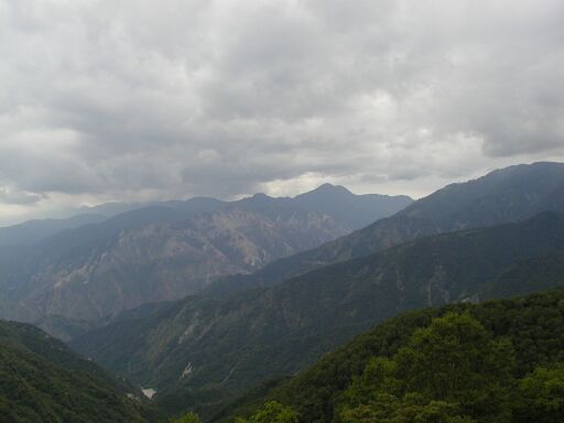 | 中禅寺湖の南側に有る半月山展望台から見た皇海山。手前の岩肌は松木川渓谷周辺。 |