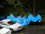 雨でブルーシートを掛けられたバイクたち。