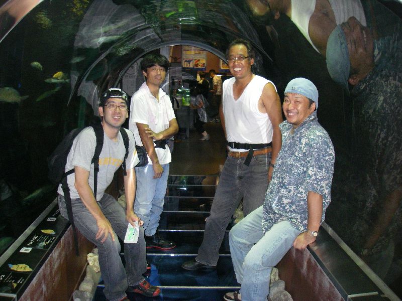 アーチ状の水槽の中で記念撮影