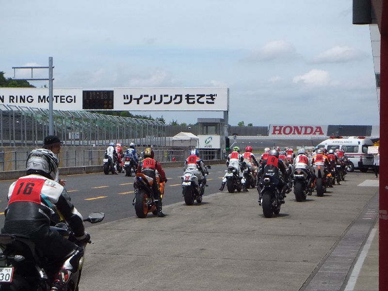 | RIDERS CLUBのライディングパーティ パドック前に並んで順にスタート 10人程度のグループに先導がつきます |