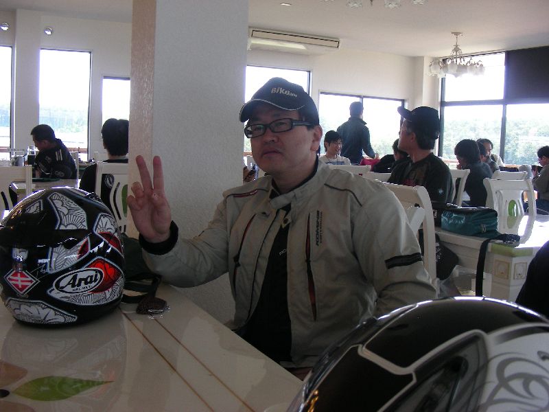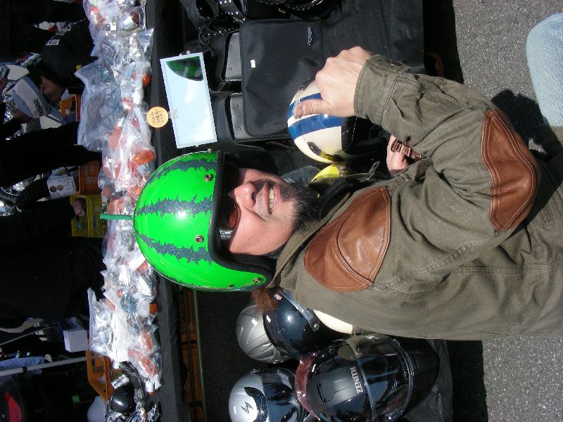 | ヘルメットのメンテ中のヒデさん |