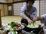 すき焼き鍋を前に 岩魚の刺身をつまみに一杯。