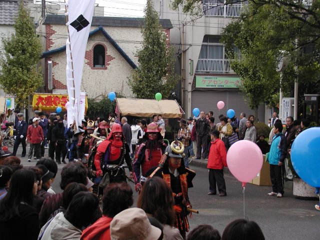 祭りの会場(市役所)では長篠の戦いの頃の武者に扮した行列が練り歩いていました。 この辺は、多分 武田の赤備え。 |