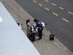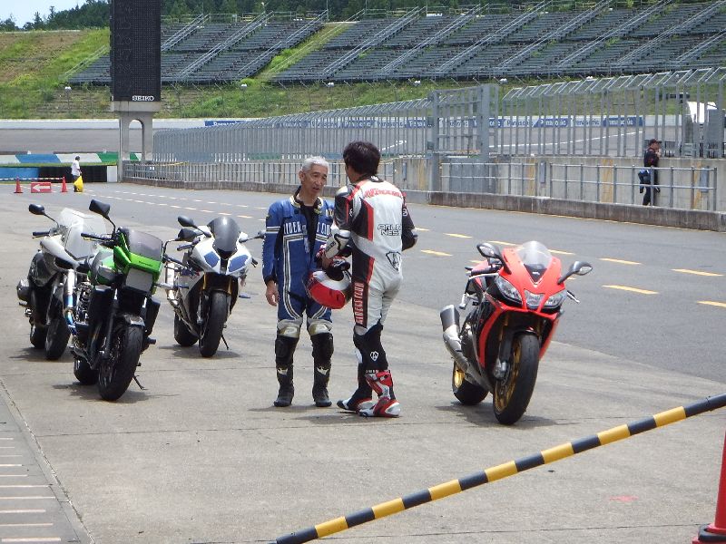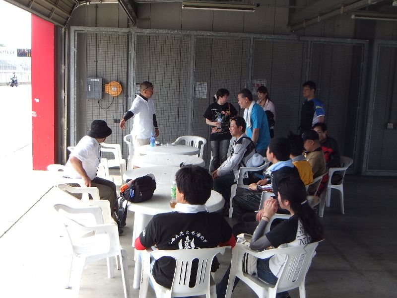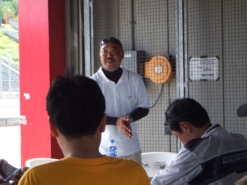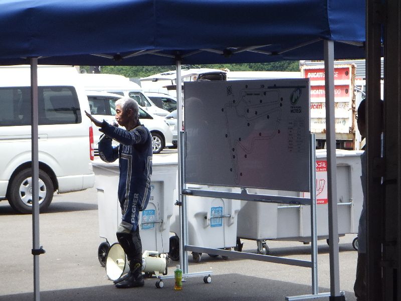 | 立て続けに転倒者が出たため、「ネモケンさんの安全講習」を前倒しで開催。 注意が必要な場所の説明に続いて、タイヤのグリップについてアドバイス。 今日のように天気が良いと 温度が上がりすぎてタイヤがグリップを失いやすいので、「ギアを1つ上げてトルクを抑え気味で走ると良い」との事でした。 |